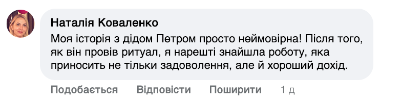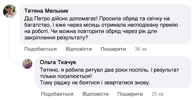 — Мої обряди – це поєднання молитви та особливих слів, які мають на меті направити енергію на добробут. Я проводжу іменні молитви, які читаю індивідуально для кожної людини. Щоб усе спрацювало, потрібна певна підготовка. Людина повинна опівночі запалити свічку і промовити: 'Хай все станеться як має статися, та буде – як буде. Ці слова пробуджують енергію достатку та удачі. Після цього людина відчуває, як в її житті починають відбуватися зміни – гроші знаходять шлях до її дому.