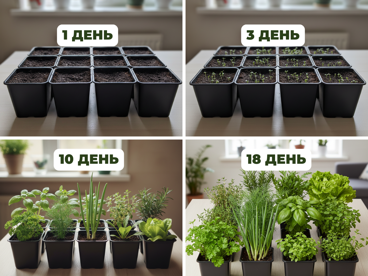 Уже з 3-го дня з’являються перші паростки руколи, салату, кропу, петрушки та зеленої цибулі, а поруч із ними впевнено стартують пряні трави: базилік, м’ята, орегано, розмарин чи чебрець (залежно від набору).